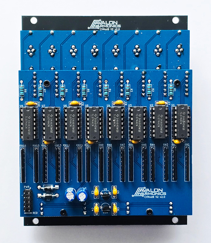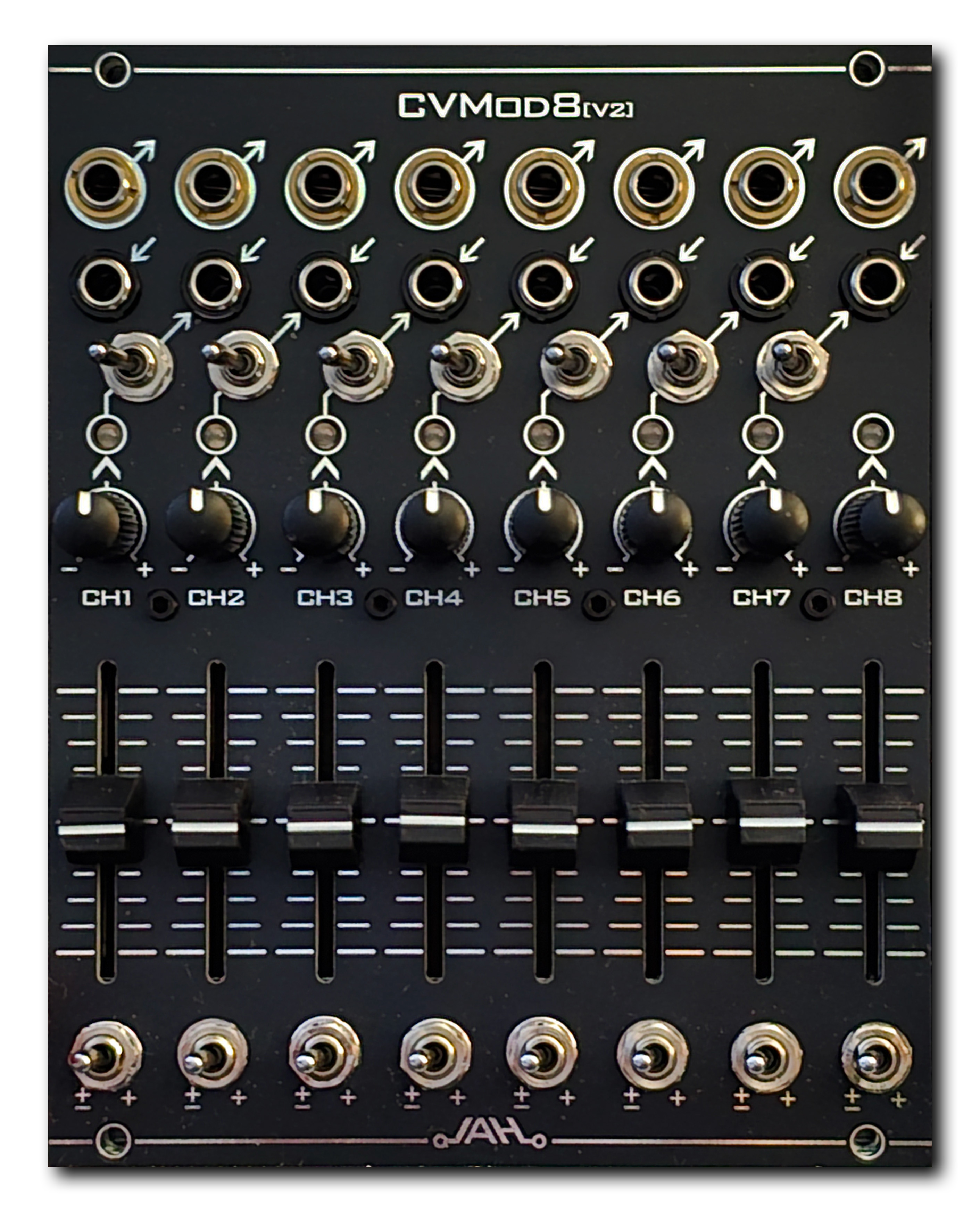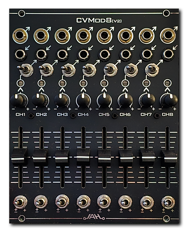 CVMod8 V2 is successor to the old CVMod8. The module provides 8 channels of independent CV attenuverters and offset controls, as well as offset polarity switches and forward switches for mixing the channels together.