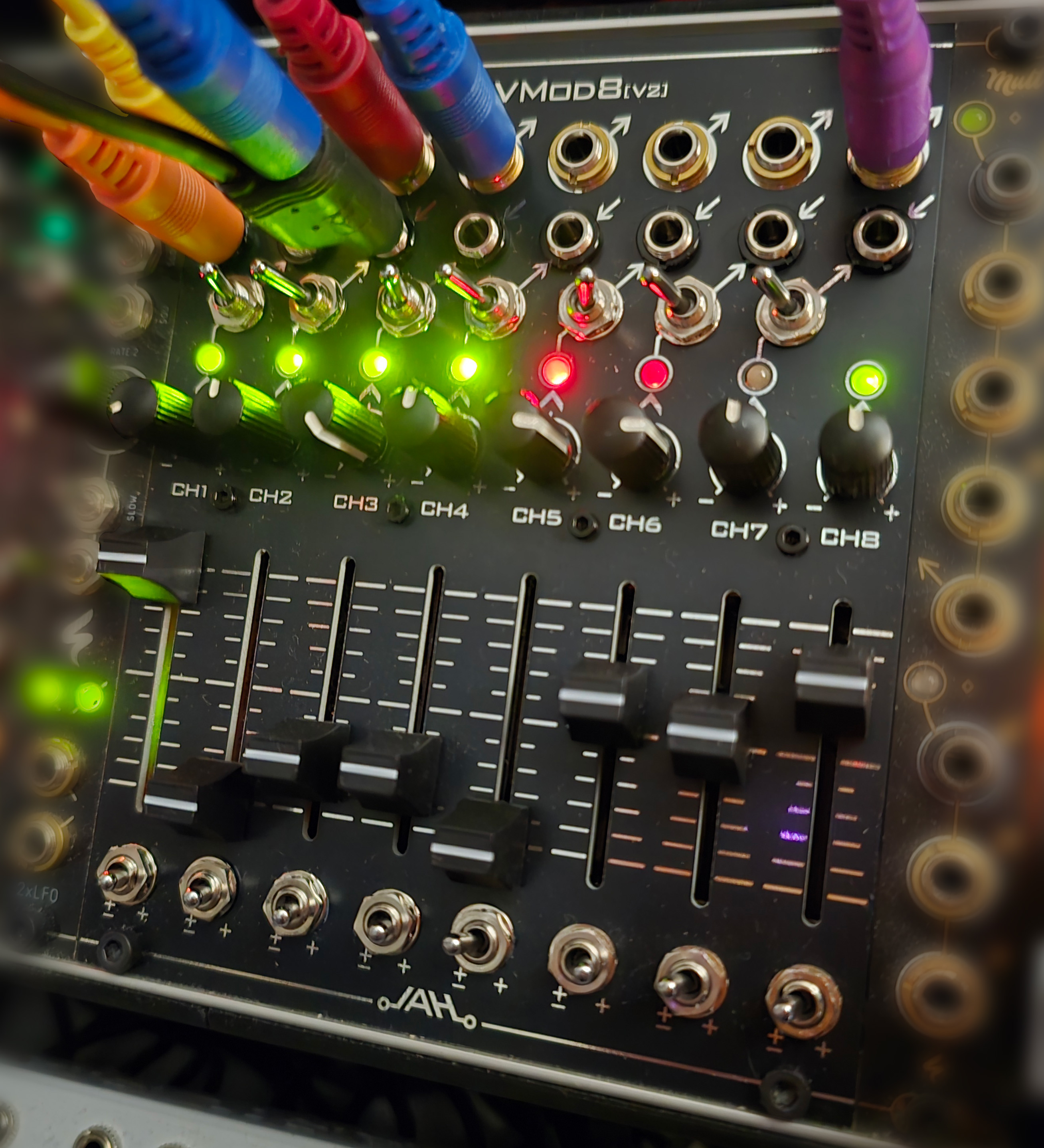 The forwarding feature can be used to chain multiple channels together acting as a CV mixer with outputs still available on each channel. Plugging a cable into one of the outputs does not interrupt the forwarding, so it is possible to make use of submixes. If a need arises for an audio mixer, setting offsets to unipolar mode and sliding them all the way down will achieve this kind of behavior.