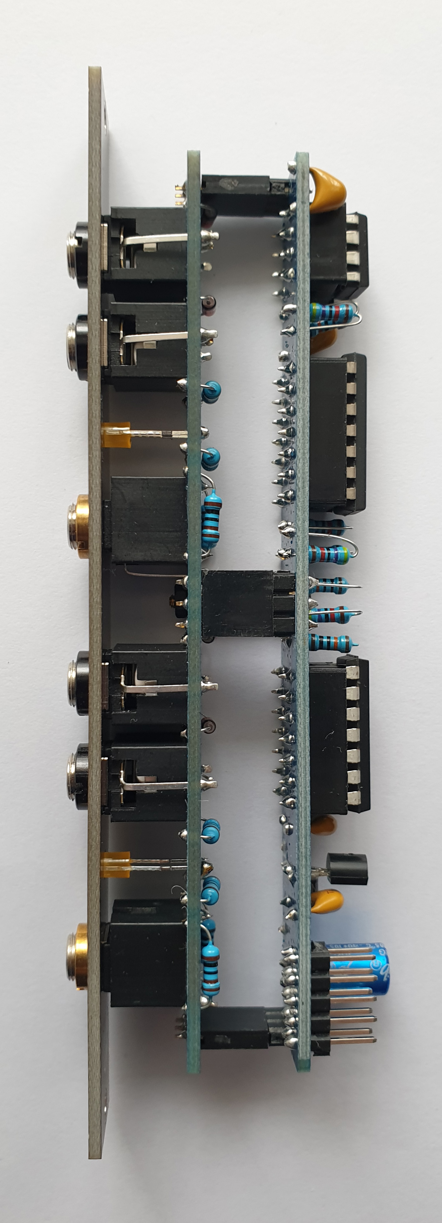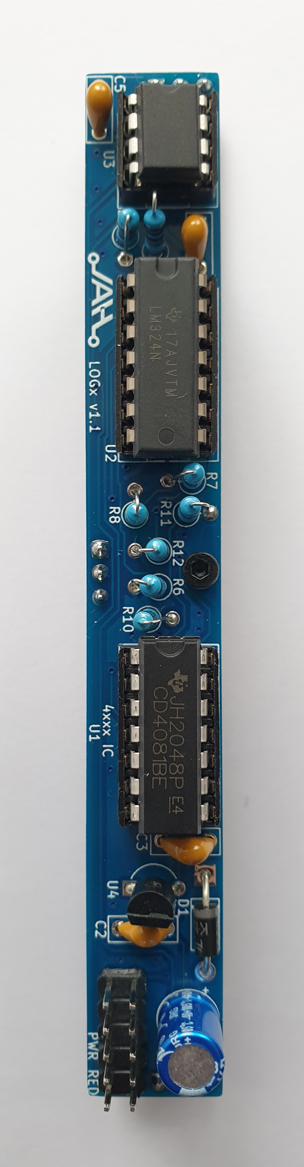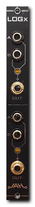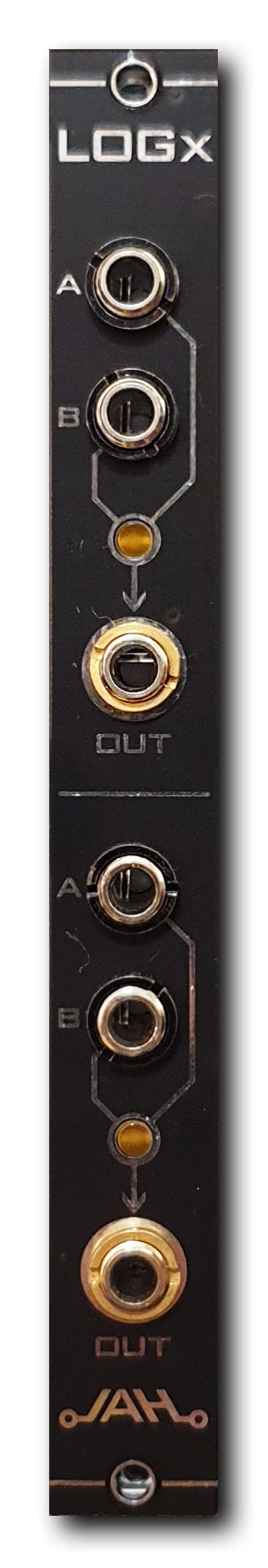 LOGx provides two independent logic gates. The types of gates depend on the chip inserted on the PCB, meaning the module can have AND, OR, XOR, etc. gates. The circuit accepts the standard 4000-series CMOS logic ICs. The module works great when driven by gate signals, allowing you to do logical operations on them. For instance, outputting a gate signal when both inputs are high (AND gate), or outputting a gate signal when only one or both inputs are high (OR gate).