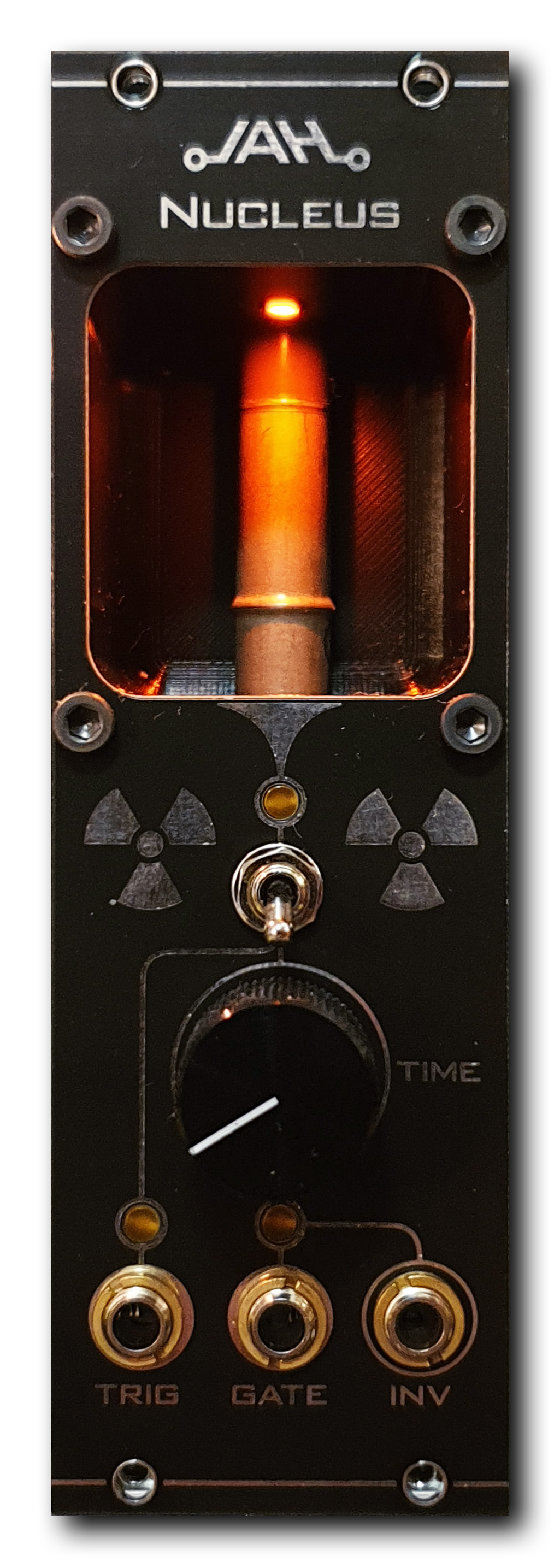 Nucleus is the module which sparked the start of Avalon Harmonics modules. It is a Geiger counter powered trigger and gate randomizer. The Geiger-Müller tube can be accessed through an alcove in the upper section of the module, allowing a radioactive sample to be placed, but module produces decent clicks even with just background radiation. An LED inside the alcove illuminates the tube for added effect.