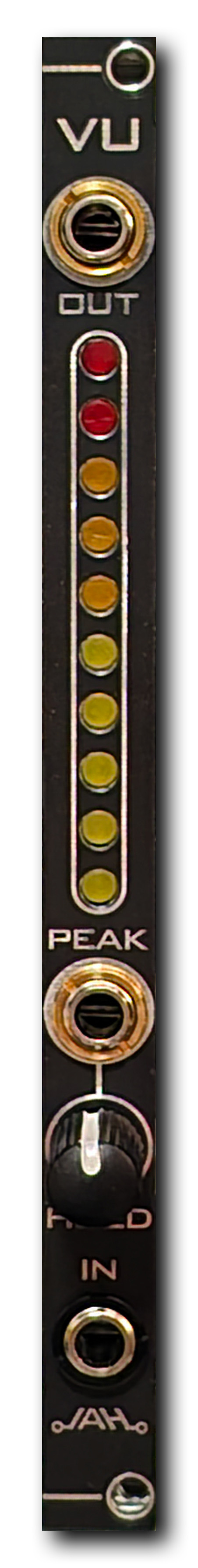 VU is a highly compact mono VU meter and envelope follower. The VU display consists of 5 yellow, 3 orange, and 2 red LEDs. The module provides an input jack on the bottom, and a buffered output jack on top, allowing it to be placed right before the master output if so desired. Note that there is no AC coupling, so the module can also be used with slow moving CV signals if so desired.