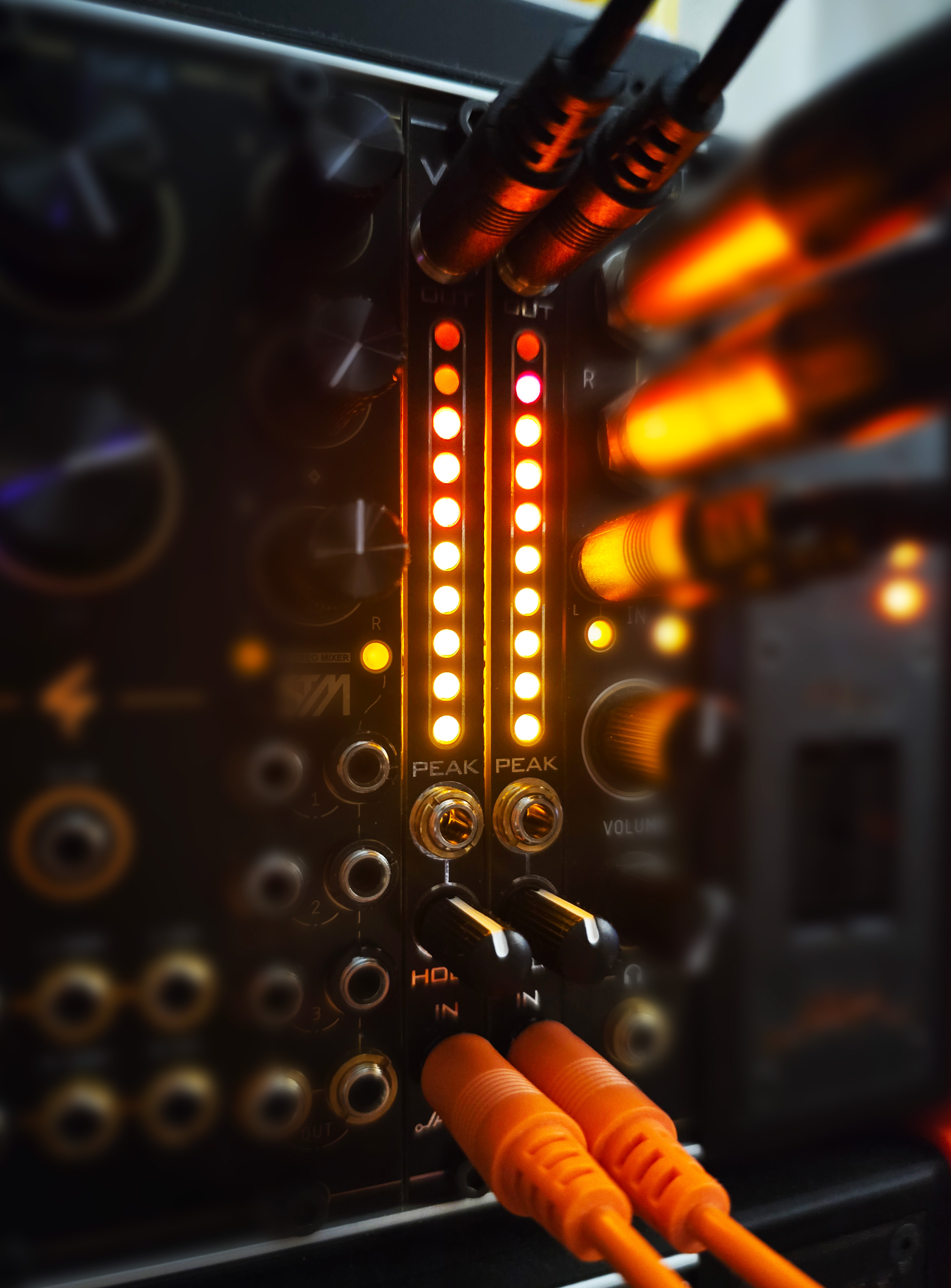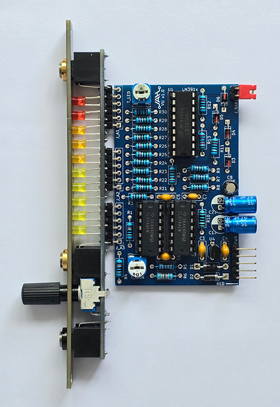 In order to make the module compatible for different rack setups, a trimmer on the PCB (T_GAIN) allows you to adjust the internal gain of the envelope follower input. This allows you to adjust the VU meter so it hits the peak exactly when it would usually clip on the output module, or whatever is after it, ensuring a more accurate display. This gain does NOT affect the buffered output.