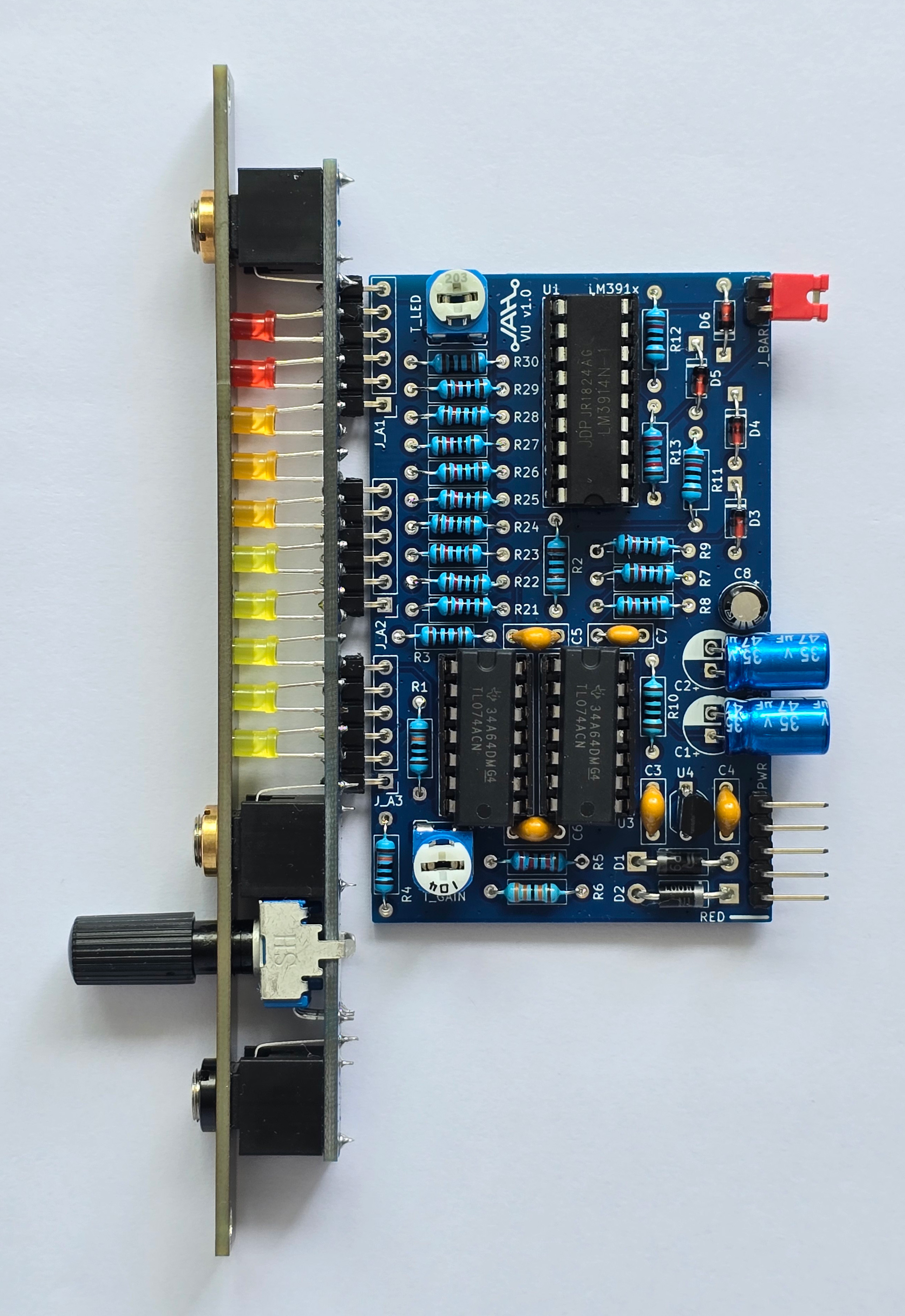 VU meter can be in either bar or dot mode. This is selected by placing a jumper on the PCB. Leaving the jumper on puts the display in bar mode. The response curve of the VU display depends on the inserted LED driver chip. Three variants of the chip exist and are interchangable on the PCB. The compatible chips are: